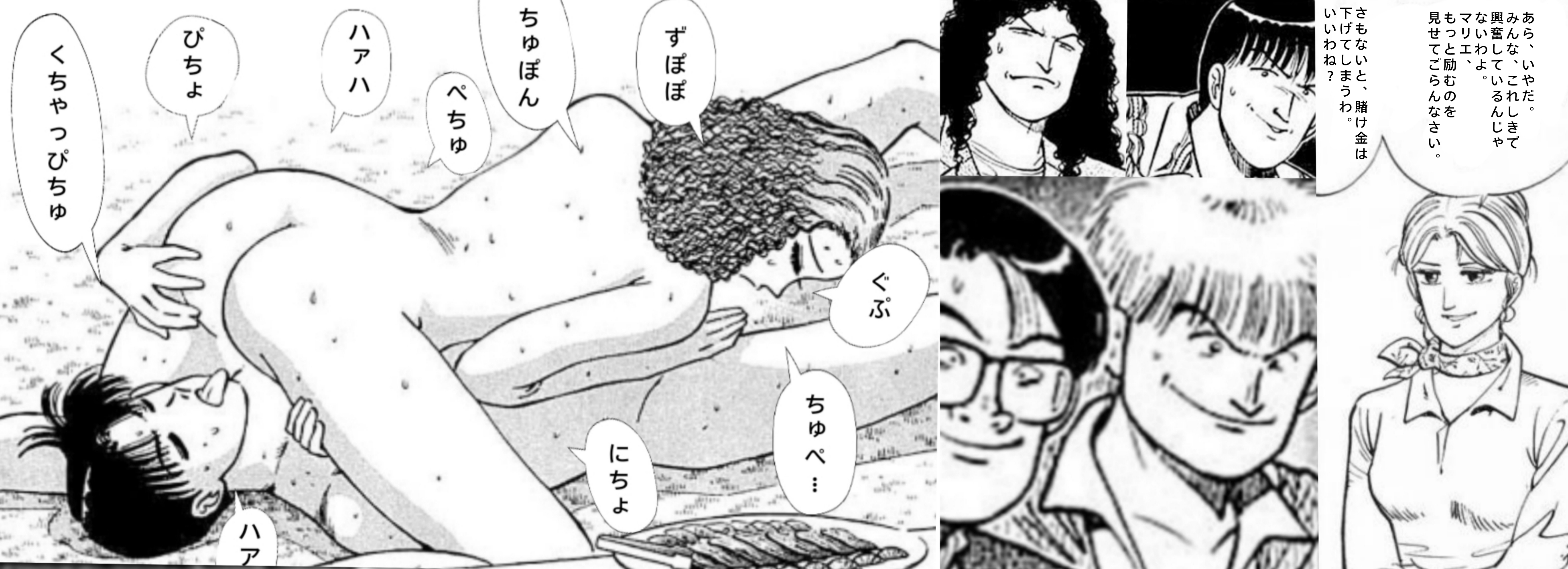 前島マリエの軍資金は一気に消え(それまでに単純なカードゲーム類で借金は20億)、政一は自分達に濡れ場を見せられるかを賭けての参加を前島マリエに提案する。